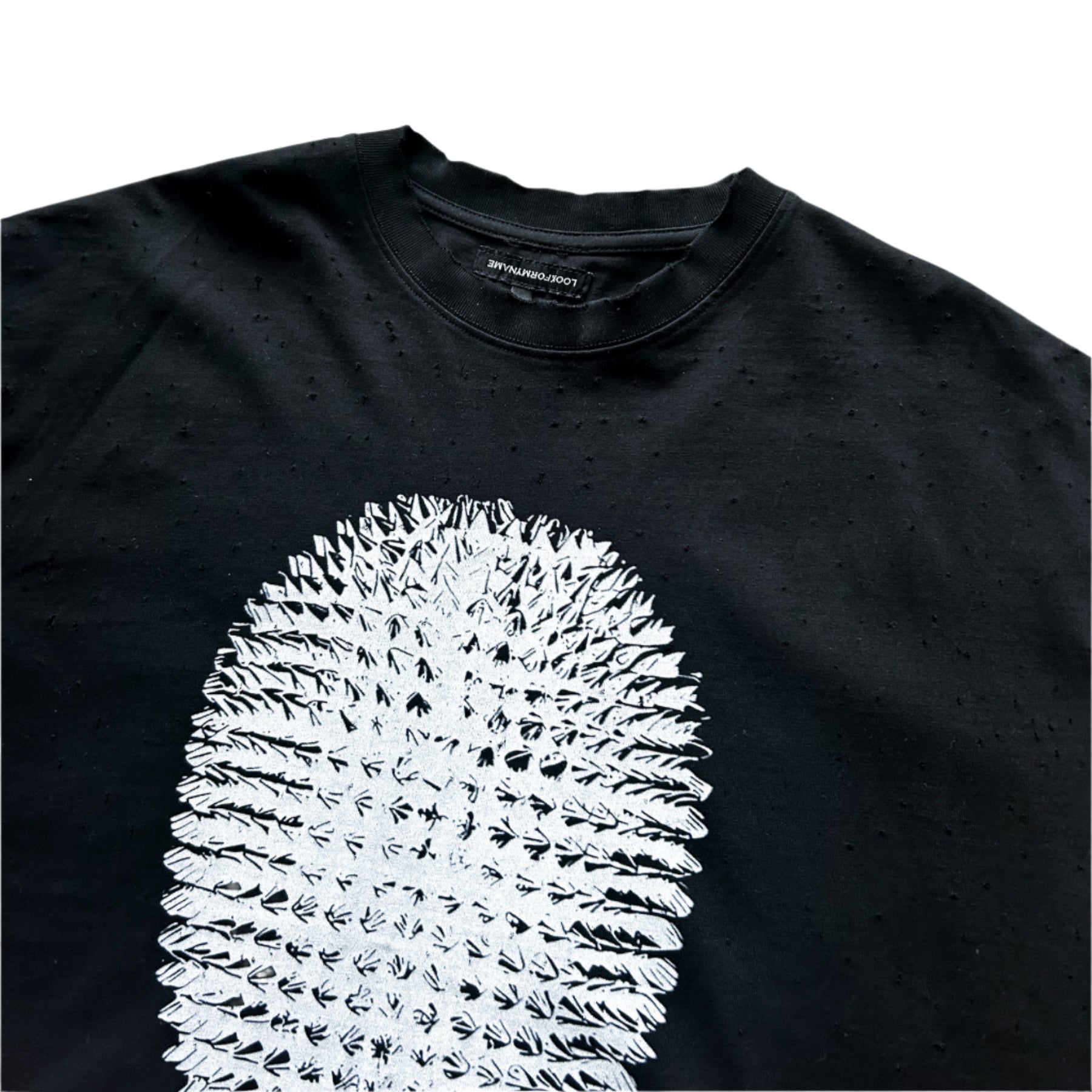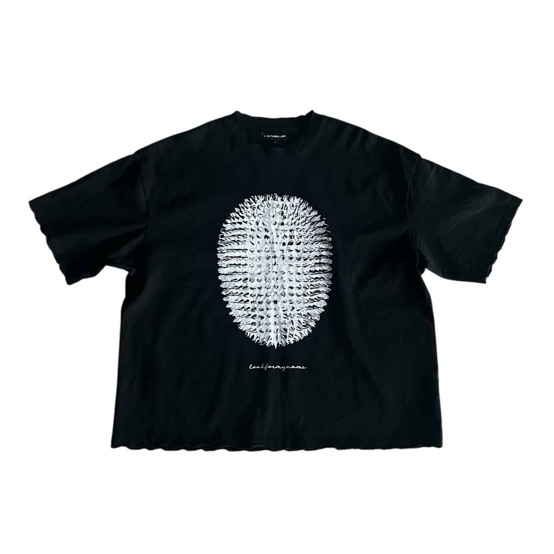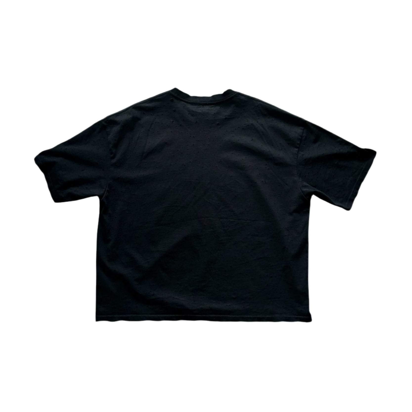 The black Spikex M1Y Tee. Featuring a boxy fit, distressed and pinched by hand. Soft 100% Cotton, breatheable for the warm season. DTG printing on the front. Unisex.