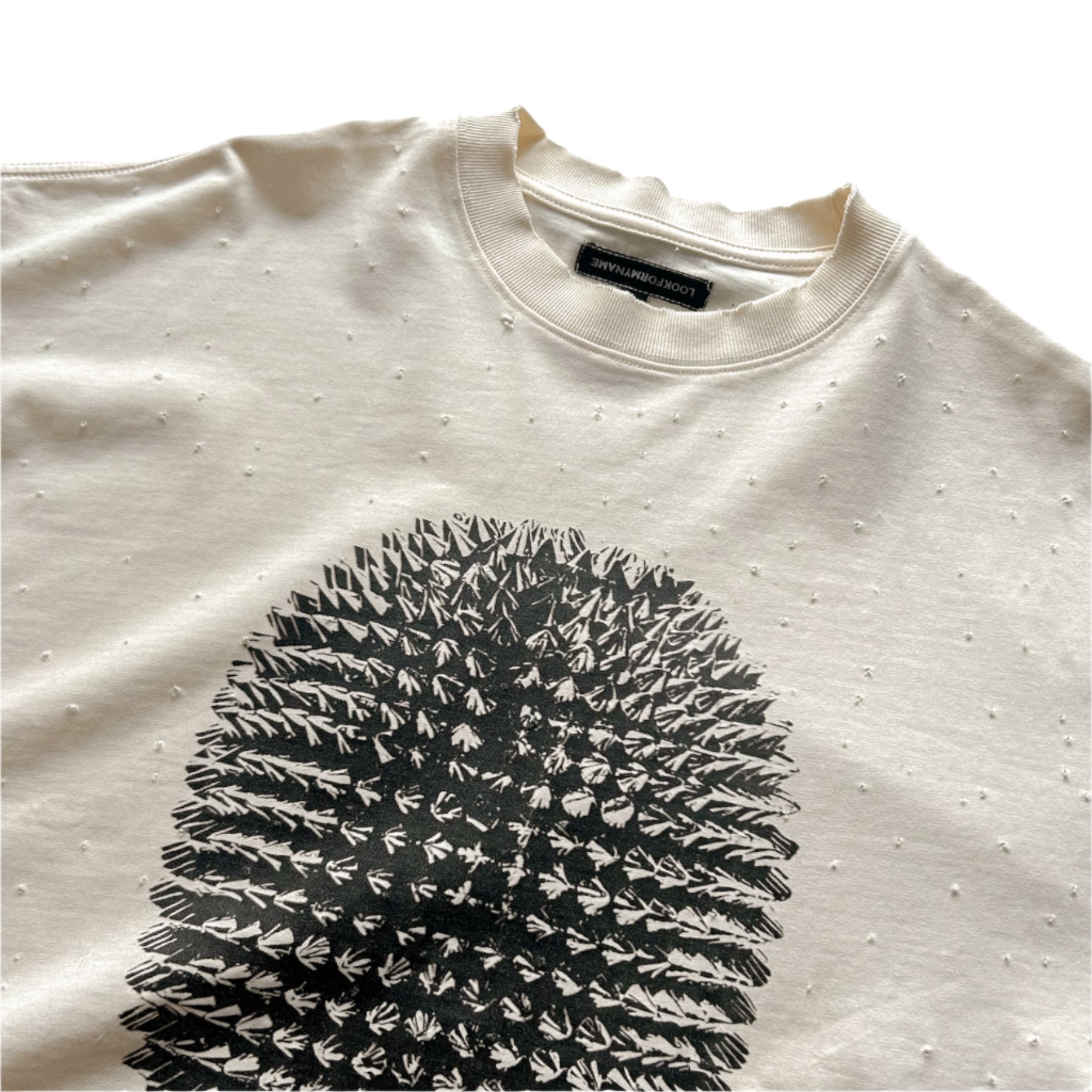 The off white Spikex M1Y Tee. Featuring a boxy fit, distressed and pinched by hand. Soft 100% Cotton, breatheable for the warm season. DTG printing on the front. Unisex.